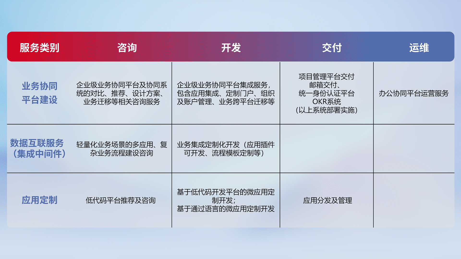 针对钉钉、、、、企微、、、IDaas等平台级产品提供产品的规划、、方案、、交付、、、定制化开发等服务,,实现如统一协同办公、、、智能客户服务、、混合会议管理、、、智能数据查询、、等业务场景,,,实现数字化转型。。。